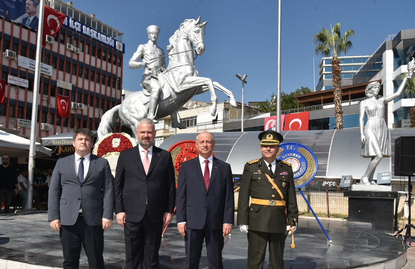 30 Ağustos Zafer Bayramı’nın 101. Yıldönümü, tüm yurtta olduğu gibi Menemen’de de törenlerle kutlandı. Büyük Zafer’in coşkusu sabah Cumhuriyet Meydanı’nda düzenlenen çelenk koyma töreni ile başladı. Törene İzmir Vali Yardımcısı İsmail Çorumluoğlu, Garnizon Komutanı Topçu Albay Zekeriya Tosun, Menemen Belediye Başkan Vekili Aydın Pehlivan, Menemen Cumhuriyet Başsavcısı Hüseyin Kaçar, siyasi parti temsilcileri, kamu kurumları ve sivil toplum kuruluşları yöneticileri, gaziler, mahalle muhtarları, öğrenciler ve vatandaşlar katıldı.